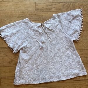 Nice flowing top in off white/cream. Has cute bell sleeves with pom poms, back tie with tassels and bodice is lined. Looks great with any solid color on bottom. Top is in excellent pre-loved condition. Listing is for top only.