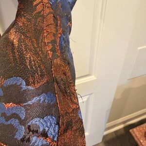 Very cool vintage Anthropologie pants with metallic copper and cobalt blue floral brocade pattern. Straight leg, low rise fit. Some slight snagging on lower leg (see photo) but otherwise great condition.