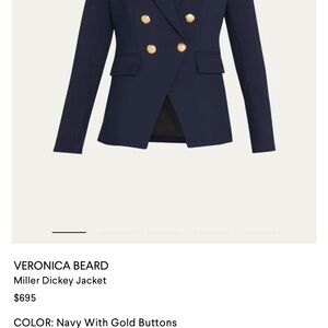 Chic navy blazer by Veronica Beard. Features striking gold buttons. Perfect for a polished look.