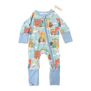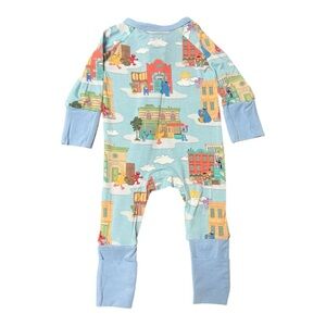 This adorable kids footie showcases a vibrant Sesame Street design on a calming blue background. Ideal for little adventurers, it offers both comfort and playful charm.