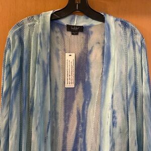 Belldini Women’s Open Front Watercolor Cardigan Sweater in Salt Water Combo Blue Teal. Nautical, Cruise, Vacation. Brand new with tags. Measures 35.5 inches in total length and approximately 23.5 inches pit to pit. Size Women’s Plus Size 2X.