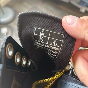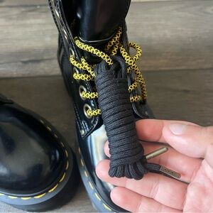 Details: Boots from Dr. Martens. Some of Dr Marten's loudest and highest boots available. Comes in their synthetic vegan leather that gives off a nice shine. These were built on their stacked 2 1/4 inch Quad Max sole. So these definitely add some height. Oversized eyelets and laces with metal aglets. Features their iconic yellow stitching going across the outsole. Zero animal product. Features two sets of laces. One is a yellow/black rope lace pattern. The other one is a plain black color. Cream colored pull tabs to indicate vegan leather.