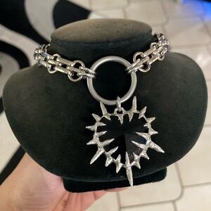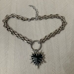 Thick Black onyx stone spike st valentine gothic heart stainless steel choker . Chunky link chain is stainless steel and is adjustable 16 to 17.5 inch long . Genuine faceted black onyx gemstone heart charm . TAGS : Bold / chunky Silver necklaces / chokers / hearts charms / boho / bohemian / st Valentine / Goth / gothic / black stones / emo / punk / rockabilly / cyber / industrial / rocker / studs / spikes / pin up / steam punk / wicca / witch / fairy / medieval fair / viking / victorian / be mine , date night , angel wings , love , i love you , forever love , cupid , rock , rock & roll , gift / urban / Stylish / trendy , hand crafted / fun chokers / casual / clubbing / music festival / handcrafted / black heart