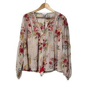 Time and Tru Floral Embroidered V Neck Tassel Blouse Women Size S