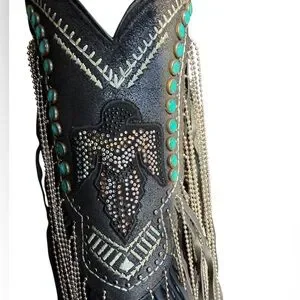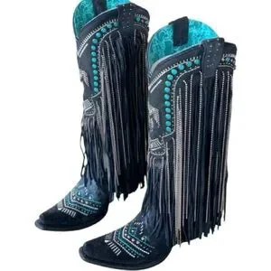 CORRAL EMBROIDERED AND CRYSTAL Black and Turquoise Eagle FRINGE WESTERN BOOTS