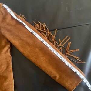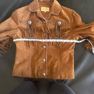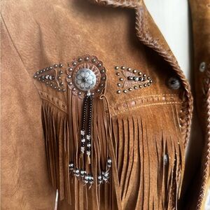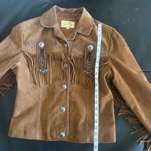 Unique suede jacket with fringe and stud accents. Button-up front. Perfect for an alt country look.