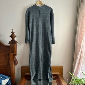 Knitted midi dress with a crew neck and seam details. In the color Charcoal. No notable flaws, gently worn. Has side slits.