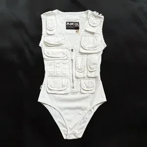 Stylish white utility bodysuit with multiple pockets. Perfect for a chic and functional look.