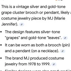 MJ (Marie Jennifer) Vintage Signed Large Grapes & Leaves Brooch/Pendant. P