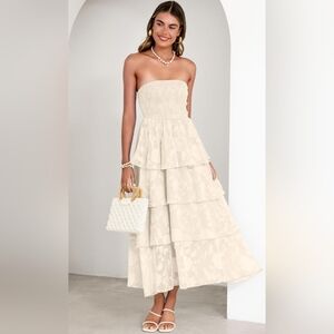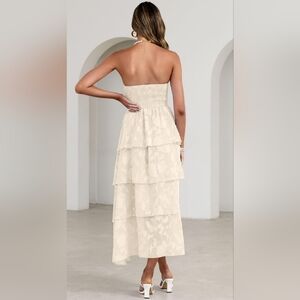 Brand new 2026 release. Beautiful boho-style strapless maxi dress with a floral textured design and tiered layered skirt. Lightweight, soft, and very versatile. Can be worn on its own in warm weather or layered with a cardigan, denim jacket, shawl, or kimono for cooler seasons. Smocked bodice offers a comfortable and secure fit while giving a flattering silhouette.