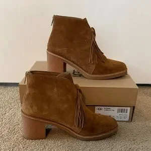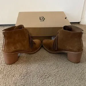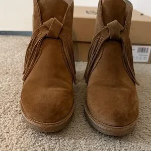 Chic UGG suede boots with fringe. Ideal for stylish outings. Comfortable rubber sole with back zipper.