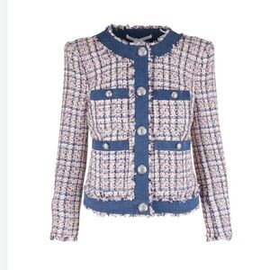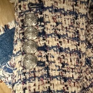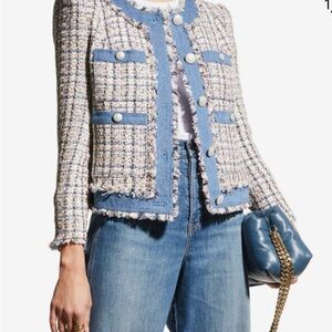 Stylish tweed blazer with striking blue trim. Features decorative buttons and a tailored fit. Perfect for a sophisticated look.