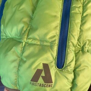 Bright lime green puffer jacket with a cozy hood. Features a full zip closure and side pockets. Ideal for cold weather.