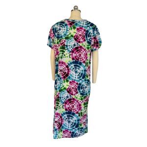 Keywords: Rouge dress, tie dye dress, short sleeve dress, knee length dress, multicolor dress, women's fashion, casual dress, breathable fabric, 2XL dress, pre-owned dress, garden party dress, brunch outfit, circular pattern, comfortable dress, women's clothing.