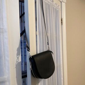 Chic crossbody bag with a sleek design. Features a smooth finish and adjustable strap. Ideal for versatile styling. Beautiful Italian made black smooth leather bag Interior flap is suede , lined interior bag with zip pocket and card slot Silver hardware Adjustable and removable crossbody/shoulder bag Excellent condition