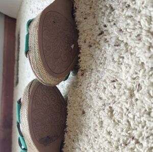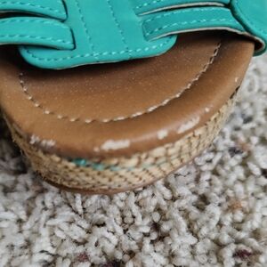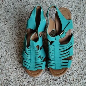 Vibrant turquoise wedges with strappy design. Comfortable and stylish for any outing.