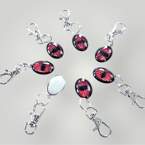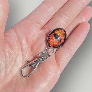 Unique handmade glittery orange/red dragon eye keychain with a silver clasp keychain. Perfect for adding a mystical touch to your keys. Complete with a “Handmade” tag and pretty organza gift bag. Every dragon eye is slightly different being each hand crafted item a one of a kind! Great for yourself or gift as a gift! 🎁