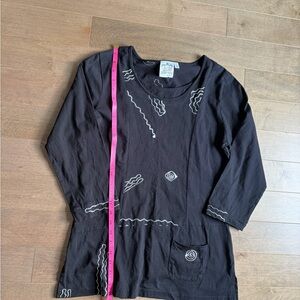 Elegant black top with intricate white detailing. Ideal for versatile styling.