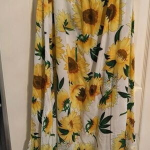 Never worn, new with tags Kiss The Sky dress. Dress is white with yellow sunflowers. Dress buttons down the chest and then ties at the stretchy waist. High-low design with ruffles around the bottom. Size large. 100% rayon.