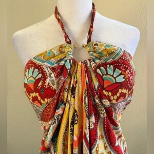 Make a statement in this Heartsoul halter maxi dress, featuring a bold bohemian patchwork print in warm red, mustard, turquoise, and cream tones. The gathered halter neckline with gold bead accents adds a touch of glam, while the flowy silhouette makes it perfect for beach vacations, resort wear, or summer festivals.