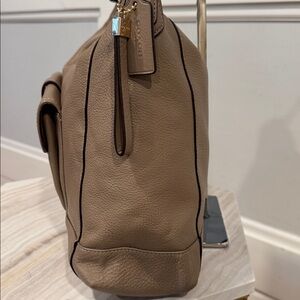 Add a touch of classic elegance to your collection with this beautiful Coach shoulder bag. Crafted from high-quality pebbled leather in a versatile taupe shade, this bag is perfect for everyday use or special occasions. The front features a stylish buckle pocket for easy access to essentials, complemented by gold-tone hardware for a sophisticated finish.