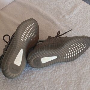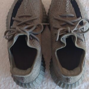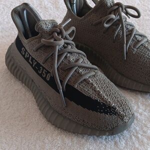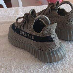 In great condition, Jeezy Boost athletic shoes in size 6.5 women/5.5 men's. Olive green/black colorway, breathable mesh uppers, thick cushioned soles with boost cushioning, decorative stitching, classic Adidas 3 stripes at heel