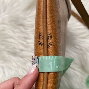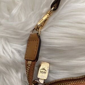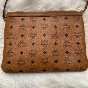 Stylish MCM crossbody bag in brown with monogram design. Perfect for any occasion.