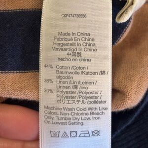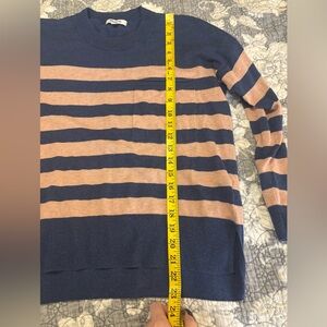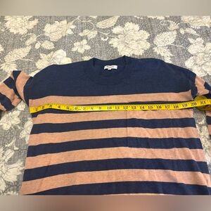 Stylish crew neck lightweight sweater with navy and tan/light pink stripes. Features a front pocket. Perfect for casual wear. Pit to pit is 20 and length is 21 in the front 23 in the back. Oversized fit.