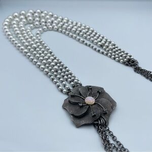NY Gunmetal Multi-Strand Faux Pearl Necklace with Flower Accent 31”+ 3”Extender