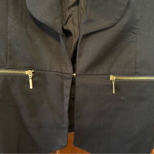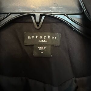 Elegant black blazer by Metaphor. Versatile and stylish. Gold hardware, wrinkled from storage. Clasp in middle. Worn once for a job fair