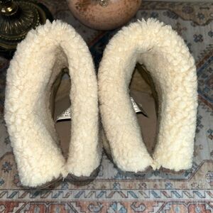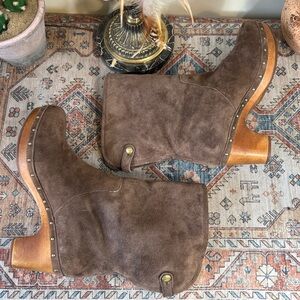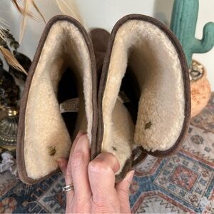 UGG Fold Over Suede Leather Burnished Toe Brown Shearling Cuff Clog Boot