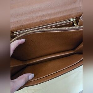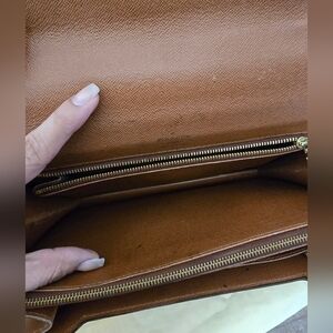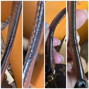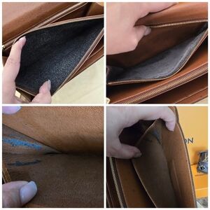 In good condition, it has normal signs of wear and tear. Glazing has deep cracks, creasing and splits around the bag and on the handle part. I painted the edges with dark brown coating. Canvas are in good condition. Inside: There is dirt, rubs, discoloration, and some dark spots. I cleaned the pockets so they can be used again. I didn't clean one of the inside pockets, so you could see some cracking on the brown material, but it is not coming off. Please see the pictures for details. Handle is a little bented/creasing, but it does not affect the bag. Gold hardware has wear and tear, discoloration scratches & the zippers work well, but a little rough to zip it. Gold clasp has normal wear and works properly. This is a vintage bag, so it has slight storage smells.