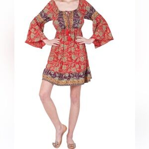 Step out in style with this elegant gold patterned dress. Perfect for any occasion, this dress combines comfort and fashion effortlessly. Pit to pit is 20 inches or 40 inches around. The waist is 11 inches and stretchy. It stretches to 20 or 40 inches around. The hips are 23 inches or 46 inches around. The length is 36 inches. Last picture shows how it looks on.