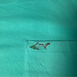 Vibrant turquoise tee with chest pocket. Comfortable and casual style.