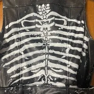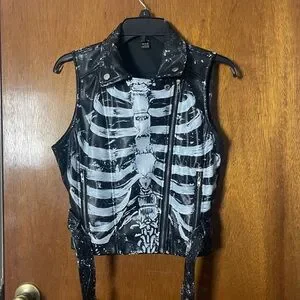 This vest was hand-painted by me to replicate WWE superstar, Rhea Ripley’s gear. Edgy faux black leather vest with a skeleton print. Features zipper details and a sleeveless design. There are some spots of white paint on the inside of the jacket due to smudging. Size Large but fits more like a small-medium. Worn only once for the cosplay. Smoke free home.