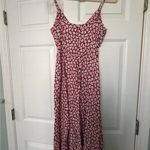 Reformation classic - midi dress with a red and white floral design, red buttons down the center and an adjustable tie in back. Features spaghetti straps and a side slit. Perfect for summer or fall and looks great with a denim jacket. Worn a few times, never machine washed, only ever dry cleaned.