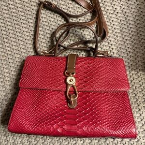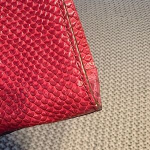 This stylish snake print handbag is perfect for any occasion. Its unique design and vibrant color make it a standout accessory. Has a short handle with a detachable long strap.