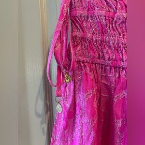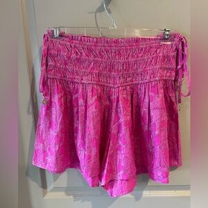 New with tags and never worn, this Milly Cabana Wendy Lurex Jacquard skort features a flowy silhouette that looks like a skirt with the comfort and coverage of shorts underneath. Crafted in a shimmering pink lurex jacquard with adjustable side ties and signature logo charms for a luxe finish. The elastic waist has excellent stretch and is fully intact.