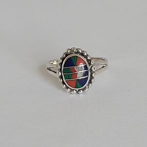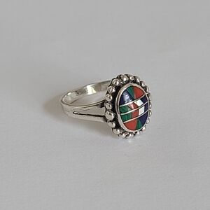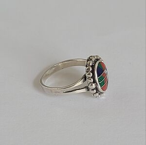 Vintage Boho Navajo Sterling Silver Inlaid Coral Lapis Malachite Mosaic Ring 5
