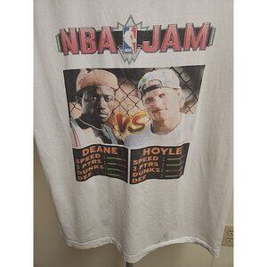 The DEANE V HOYLE WHITE MEN CAN’T JUMP BASKETBALL VIDEO GAME PARODY SHIRT is a unisex tee made of cotton with a solid white color and short sleeves. It features a crew neck and is designed for regular fit in size M. This shirt is part of a limited edition collection from 2020-2029 and is perfect for various themes such as festival, happy, colorful, grunge, cowboy, birthday, classic, retro, logo, hipster, school, funny, comics, and sports. It is lightweight, packable, and suitable for all seasons, making it a versatile and fun addition to any wardrobe. Any questions feel free to ask.