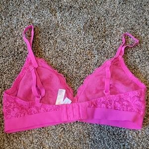 Hot pink lace bralette. No under wire. Cups lined. Lace see through on sides. Adjustable straps. All clasps in tact. Excellent condition. equivalent to a women's small. Band laying flat while clasped as small as 12 inches, as big as 17.