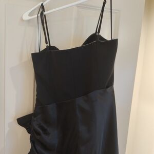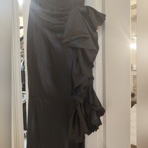 This stunning black evening gown features a sleek design with delicate straps and a beautiful ruffle detail. Perfect for any formal occasion.