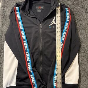 Stylish Jordan jacket in black, white and red. Features iconic logo and vibrant stripe details.