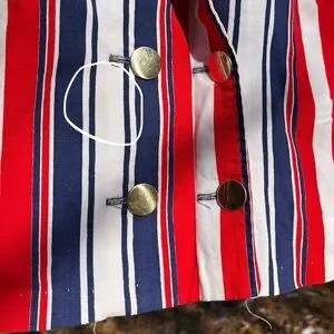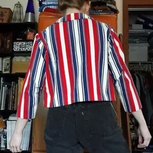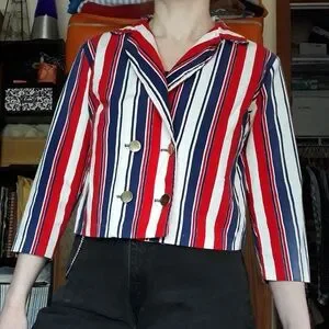Vintage 70s lovingly handmade red, white & blue striped double breasted distressed blazer jacket! I like this in a retro Yankee Doodle Dandy way… and that way only. I’m just hoping to find this a good home! Gold-toned buttons, cropped bracelet sleeves, unlined. Feels like a canvas-y cotton. Fits like a Women’s M modeled on a S/M 34B 5'5". Fits me well. Unisex.