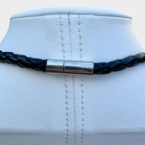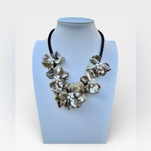 This item is a statement necklace featuring large, iridescent Mother of Pearl shell flowers and freshwater pearls on a black braided leather cord with a silver magnetic clasp. The flowers are crafted from wire-wrapped iridescent white and brown shells/Mother of Pearl. Small white freshwater pearls are clustered in the center of the flowers. The necklace features multiple flower components arranged as a bib or collar style focal point. This necklace is designed as a statement piece, suitable for a variety of occasions.
