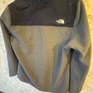 The North Face jacket with navy and gray tones. Features a zip-up front and cozy interior. Ideal for outdoor wear.