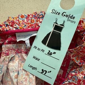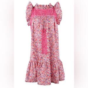 The Olivia dress features a high ruffled neck with a bias cut ruffled sleeve and drop waist. The dress is 100% cotton with hand-embroidered flowers in the upper bust area and flowers and vines surrounding the neckline. Satin ribbon adorns the straight hem. Hand-embroidered detail runs down the center of the dress.