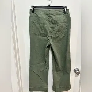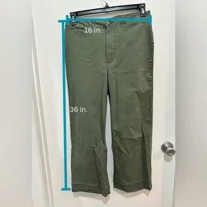 Classic olive chinos. Versatile and comfortable. Ideal for casual wear. These pants are wide leg and high rise. I wore these pants once and could not fit them again. These were definitely a favorite that was paired with a cardigan and some loafers.