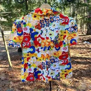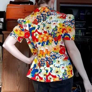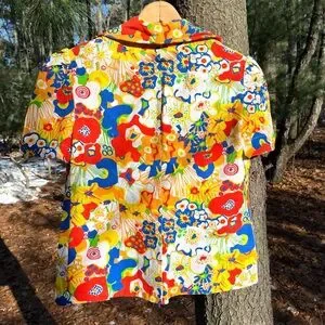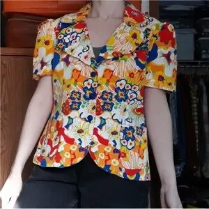 Groovy vintage 70s lovingly handmade Pop Art colorful floral puff-sleeved blazer jacket / blouse! Reminds me of the 70s artist Peter Max. Blue plastic buttons down the front, rounded collar & 7.5” back slit. 2 front pockets. Material is a canvas-y textured cotton, very comfy. No tags, fits like a Women’s size L modeled on a S/M 34B 5'5" & it's a bit big on me. Bc of darts in front, it’s supposed to be more fitted in the bust (it would look better on a M with a bigger bust I think). Unisex. You could wear this open as a jacket, but I like it buttoned. In good used condition w/no noticeable flaws besides some staining on inside collar, lapel & under arms (see pics) + I repaired a popped seam at the side. Wash cold gently + hang dry.