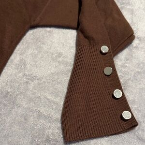 Elegant dark brown V-neck sweater top by Anne Klein. Features buttons on sleeves. Ideal for versatile styling.